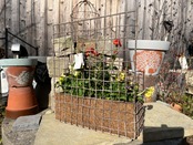 アンティーク調の塗装を施したアイアン製のウォールシェルフにお花を植え込みました。